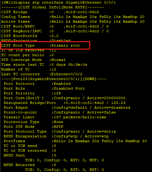 在SW1上看到当前STP模式是RSTP,且SW1是根网桥