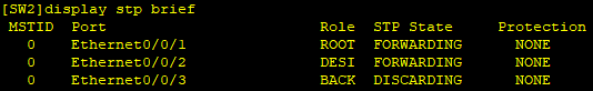 SW1作为根网桥,所连接的SW2、SW3的两个端口都是指定端口,STP状态都是转发状态;SW2上的e0/0/1是到根网桥开销最低的端口,是根端口,而e0/0/2、e0/0/3和HUB集线器连接,所以这三个端口中要选举出一个指定端口,三个端口开销相同,再比较根ID