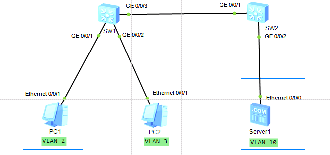 1、关注一下SW1的e 0/0/1 和e 0/0/2,两个接口要允许VLAN 2、VLAN3的流量通过,且VLAN 2、VLAN3都要访问VLAN10的服务器,又要允许通过VLAN10。对于终端来说,无法识别VLAN的信息,所以要port hybrid untagged vlan,在两个接口上分别放行VLAN。