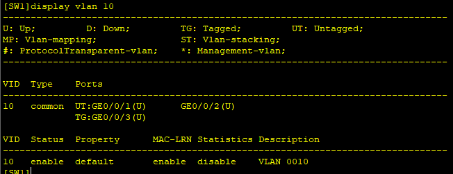 [SW1-GigabitEthernet0/0/1]port hybrid untagged vlan 2 10 #放行VLAN 2 和 VLAN 10