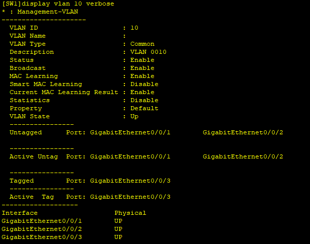 [SW1-GigabitEthernet0/0/3]port hybrid tagged vlan 2 3 10