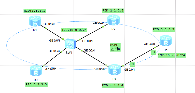 [R5]ospf router-id 5.5.5.5 #在接口G0/0/0下