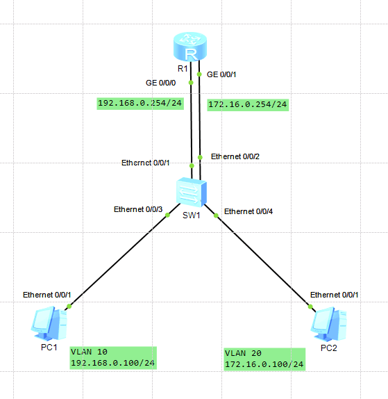在SW1上配置配置两个VLAN,将连接R1的e0/0/1和连接PC1的e0/0/3划分到VLAN10,将连接R1的e0/0/3和连接PC2的e0/0/4划分到VLAN20