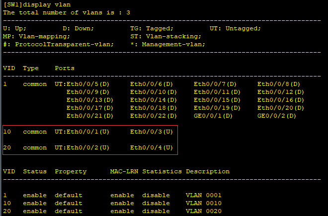 [SW1-Ethernet0/0/3]port default vlan 10