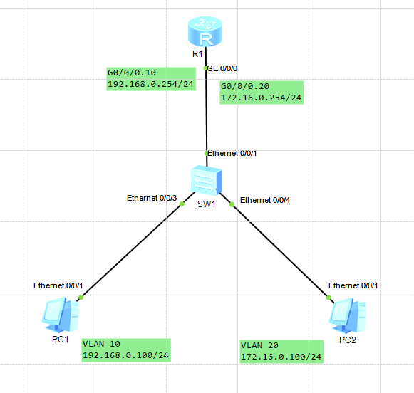 R1只通过物理接口连接SW1,在逻辑上通过两个子接口.10和.20来连接SW1
