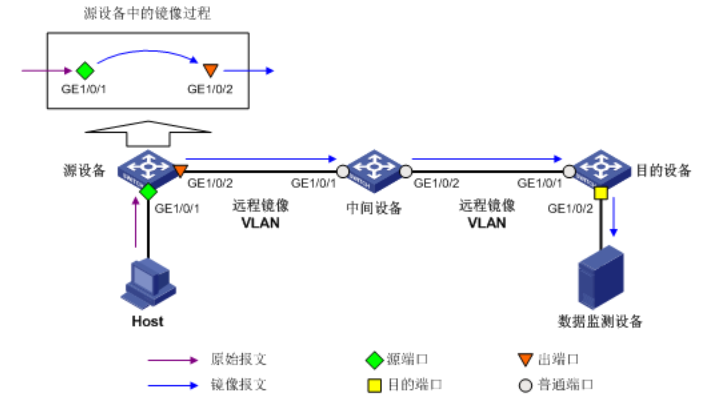 由于源设备与目的设备之间通过二层网络进行连接,因此远程端口镜像又称为二层远程端口镜像。