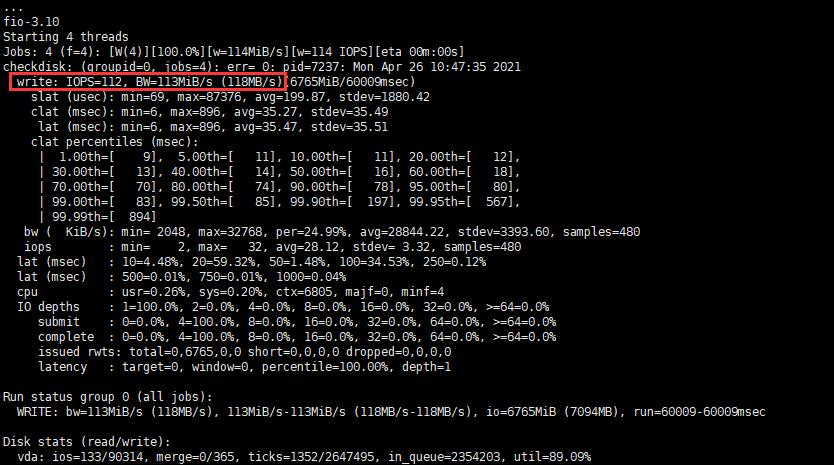 WRITE: bw=113MiB/s (118MB/s), 113MiB/s-113MiB/s (118MB/s-118MB/s), io=6765MiB (7094MB), run=60009-60009msec