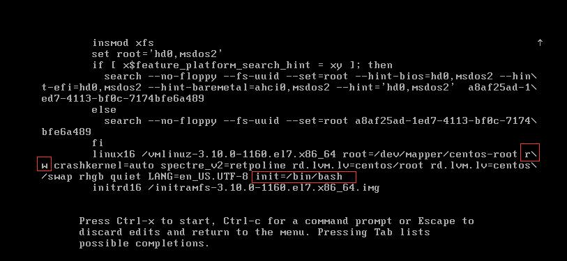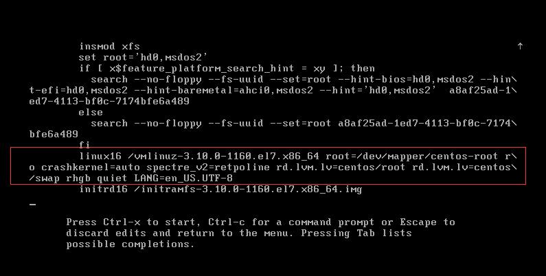 3)下翻页面将框选处的ro改成rw,在 LANG=en_US.UTF-8 后追加 init=/bin/sh